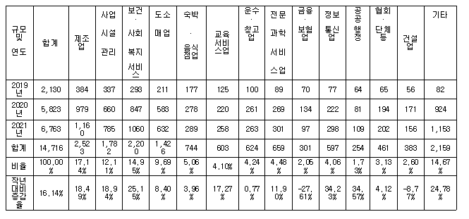 업종별 신고건수는 제조업 2,523건(17.14%), 보건사회복지서비스업 2,200건(14.95%), 기타 2159건(14.67%), 사업시설관리업 1,782건(12.11%) 순이다. 업종별 전년 대비 증가율을 보면 공공행정이 34.57%, 정보통신업이 34.23%, 보건사회복지서비스가 25.15% 증가했고, 기타도 24.78%나 증가했다.