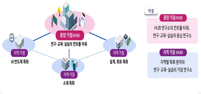 (대학 반도체 인재양성 거점) 반도체 교육 및 기초연구에 대한 핵심 기능을 수행할 수 있도록 ‘서울대 반도체공동연구소’를 중앙 거점으로 두고, 권역별 반도체 공동연구소를 설치하여 각 연구소별 강점 분야를 특성화하며, 연구소 간 협업체계를 구축한다.