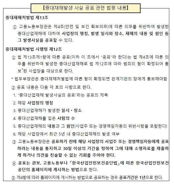 중대재해처벌법은 중대산업재해 발생에 대한 경각심을 제고하고 중대산업재해가 발생한 기업에 대한 주의를 촉구하기 위해 중대산업재해가 발생하여 형이 확정된 경우, 재해가 발생한 사업장의 명칭, 재해발생 일시·장소, 재해의 내용 및 원인뿐 아니라 해당 기업의 지난 5년간 중대재해 발생 이력 등을 공표할 수 있도록 하고 있다.