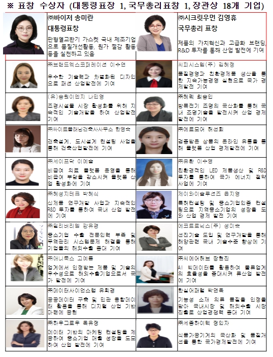 특별히 올해 최초로 대통령 표창이 신설됐으며, ‘열교환기 및 자동차 배터리 가스켓’을 생산․수출하는 ‘㈜바이저 송미란 대표’에게 수여됐다.