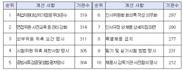 공직유관단체에 대한 개선 권고가 빈발한 항목은 ▴'국가유공자법'에 따른 취업지원 대상자 가점 및 동점자 우대 준수(319개) ▴차별 소지가 있는 질문 금지 등 면접위원 사전교육 관리 강화(314개) ▴퇴직 후 3년이 경과하지 않은 자 위촉 금지 등 외부위원 위촉 요건 명시(311개) 등이 가장 많았다.