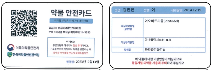 식약처는 그간 장애 보상금, 진료비 등 피해구제급여를 지급한 환자에게 부작용 피해 재발 방지를 위해 ▲환자 인적 사항 ▲부작용 발생 원인 (의심)의약품 ▲부작용명 ▲부작용 발생일 ▲발행일 ▲QR코드가 기재된 실물 ‘약물 안전카드’를 발급·제공해 왔다.