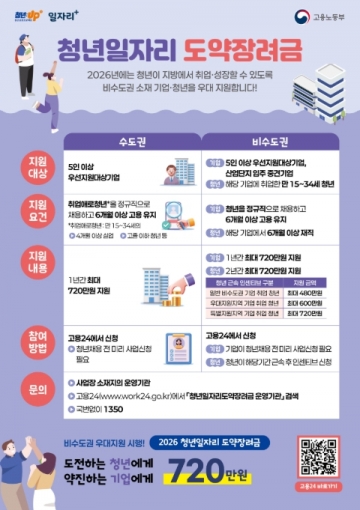 기존 Ⅰ·Ⅱ유형을 2026년에는 수도권·비수도권 유형으로 개편하고, 비수도권 기업에 취업한 청년이 6개월 이상 근속 시 2년간 최대 720만원의 근속 인센티브를 지원한다. 또한, 지방에 일자리 창출 여력이 있는 기업의 참여를 촉진하기 위해 지방 산업단지 입주 중견기업까지 지원기업 범위도 확대한다.