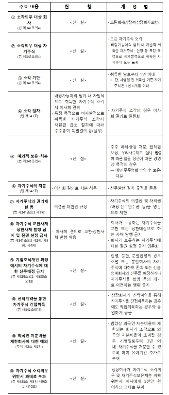 또한, 개정안은 모든 자기주식의 소각을 ‘이사회 결의’로 하도록 하여 소각 절차를 간소화했고, 법령상 외국인 지분비율이 제한되는 회사가 소각으로 외국인 지분비율이 초과될 경우 시행일로부터 3년 이내 자기주식을 처분할 수 있도록 하여 유예기간을 추가로 부여했다.