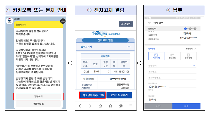 국세청은 앞으로 모바일 은행·신용카드 앱에서도 고지사실을 받아 볼 수 있는 보다 나은 납세서비스를 제공하도록 노력하겠다고 전했다.