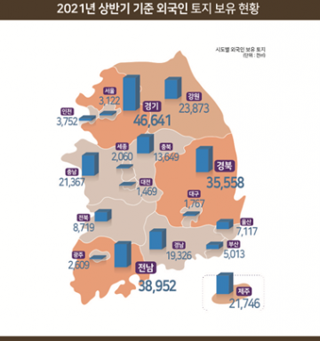 국토교통부는 ‘21년 상반기 기준 외국인이 보유한 국내 토지면적은 256.7㎢(2억 5,674만㎡)으로, 전 국토면적(100,413㎢)의 0.26% 수준이라고 밝혔다.