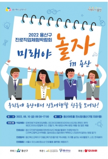 용산구가 주최하는 ‘2022 용산구진로직업체험박람회’는 용산구진로직업체험지원센터 미래야가 주관하고 ㈜오리온에서 후원한다. 미래야는 용산구가 서울시교육청과 함께 설립하고 푸른나무재단이 위탁 운영하는 센터로 청소년들을 위한 직업체험, 진로설계 프로그램을 운영하고 있다.