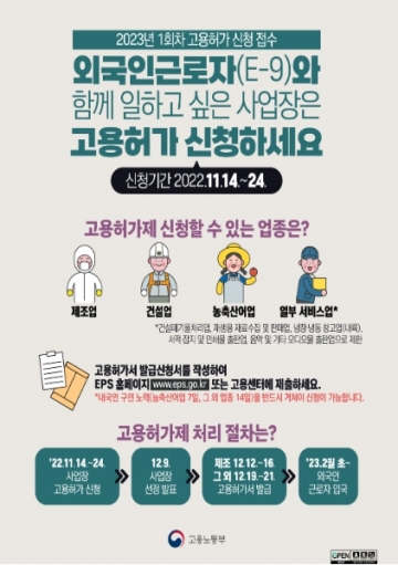 고용노동부, ’23년도 1회차 외국인근로자(E-9) 고용허가 신청 접수