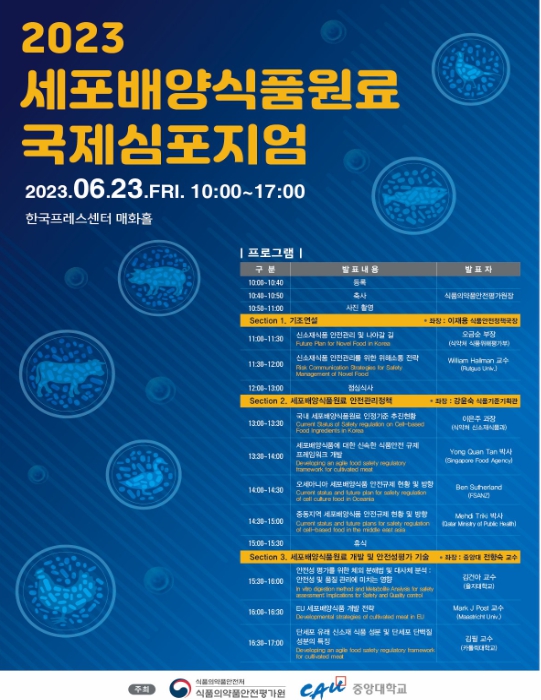 식품의약품안전처는 세포배양 등 신기술을 적용한 푸드테크의 국제동향 등 최신 정보를 교류하기 위해 규제과학 인재양성사업을 수행하고 있는 중앙대학교(총장 박상규)와 공동으로 국제심포지엄을 6월 23일 개최했다.