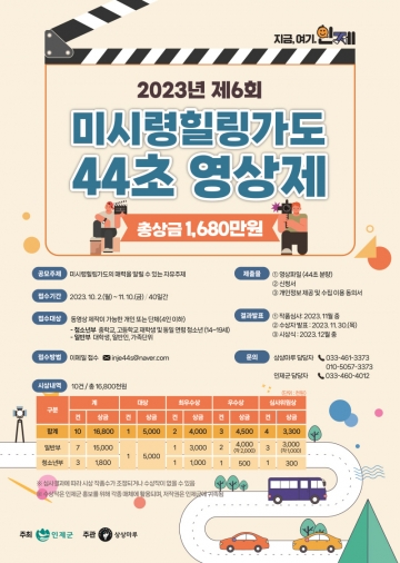 미시령 힐링가도의 매력을 알릴 수 있는 자유주제로 44초 내 영상 제작하여 2023년 10월 2일부터 11월 10일까지 접수기간 내 이메일(inje44s@naver.com)로 제출하면 된다.
