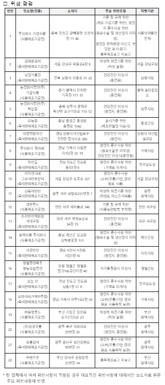 점검결과, 주요 위반내용은 ▲영업자 준수사항 위반(소비‧유통 기한 경과제품 보관 등 7곳) ▲건강진단 미실시(7곳) ▲위생적 취급기준 위반(위생 불량 등 3곳) ▲기준 및 규격 위반(제조‧가공 기준 위반 등 2곳) ▲기타사항 위반(표시기준 위반 등 3곳)이다.