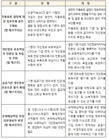 3월 15일 시행되는 개정법에는 인공지능(AI)의 확산에 따른 자동화된 결정 영역에서 국민의 권리를 신설하고, 개인정보를 보다 전문적으로 보호하기 위해 대량 또는 민감한 개인정보를 처리하는 기업ㆍ공공기관 등의 개인정보 보호책임자(CPO) 자격 요건을 강화하는 등의 내용이 포함되어 있어 개정사항을 꼼꼼하게 확인해야 한다.