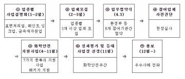 이번 협약은 환경부에서 시행하고 있는 화학안전과 관련해 △설비 교체·개선 비용 보조, △취급시설 설치검사 기술지원, △제도교육 등 7가지 종류의 사업을 ‘한 묶음(패키지)’으로 지원하여 화학안전 관리 모범사례인 화학안전 등대사업장*을 만들기 위해 추진됐다. 올해 대상이 되는 사업장은 페인트․잉크업, 표면처리업, 금속재자원업 등 총 3개 업종에서 모집․선정한다.