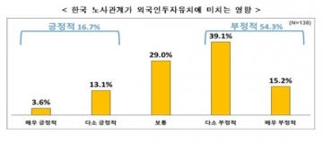 한국경제연구원이 여론조사기관 리서치앤리서치에 의뢰해 주한외국기업 중 종업원 수 100인 이상인 901개 기업을 대상(138개사 응답)으로 '주한외국기업 노사관계 인식'을 조사한 결과 한국의 노사관계가 부정적이라고 답변한 기업은 54.3%, 긍정적이라는 답변은 16.7%으로 집계됐다.