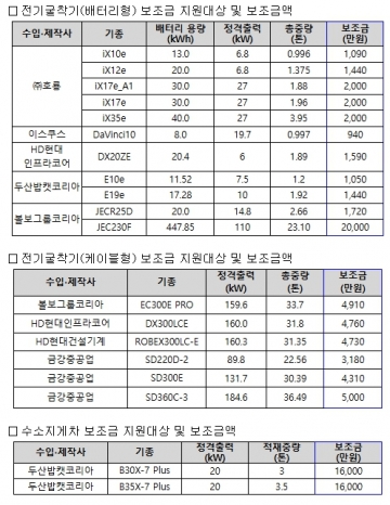 둘째, 성능이 좋은 전기굴착기의 보급 유도를 위하여 전기굴착기의 배터리 에너지용량, 모터 정격출력, 총중량에 따라 제품별 보조금 지원액을 차등화했다.
