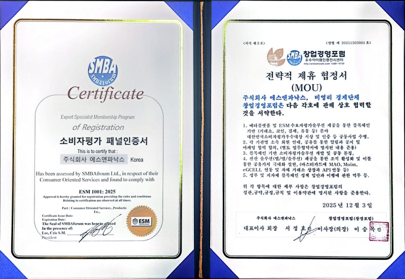 또한 12월3일 .(주)에스앤파낙스(서정호 대표)는 대한민국 소비자평가 단체 창업경영포럼과 전략적제휴 및 우수기업으로 인증 받으며 글로벌 시장으로 발돋움하는 계기를 마련했다.