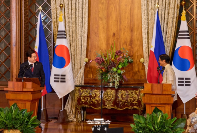이재명 대통령, 마르코스 대통령과 정상회담 후 공동언론발표"양국 힘 모을수록 조선산업 경쟁력 강화…원전 협력도 본격화""한-필리핀 핵심광물 이상적 파트너…중동 안정·평화 회복되길"
