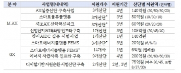 이번 통합공모를 통해 M.AX 분야 5개 사업, GX 분야 4개 사업 등 총 9개 사업, 39개 신규과제를 선정하여 올해 900억 원을 지원하며, 선정된 과제에는 향후 3~4년의 사업기간 동안 약 3,000억 원의 국비를 투입할 예정이다.