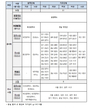 대통령상 충청북도,국무총리상 부산광역시· 전남 무안군